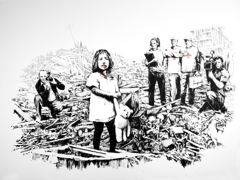 Banksy personalmente lo trovo preoccupante, ma anche angosciante perché piace a tutti! Non è possibile piacere a tutti… ma lui sì, lui piace a chiunque: dai bambini agli anziani, dai poveri ai ricchi, da chi non sa nulla di arte ai collezionisti disposti a spendere milioni di euro per una sua opera, dai post fascisti ai post comunisti, dai neocons ai socialdemocratici riformisti, dall’adolescente del liceo classico al 15enne rom analfabeta che chiede elemosina.