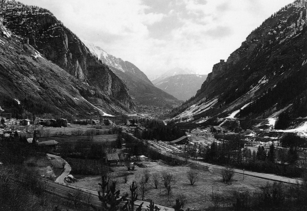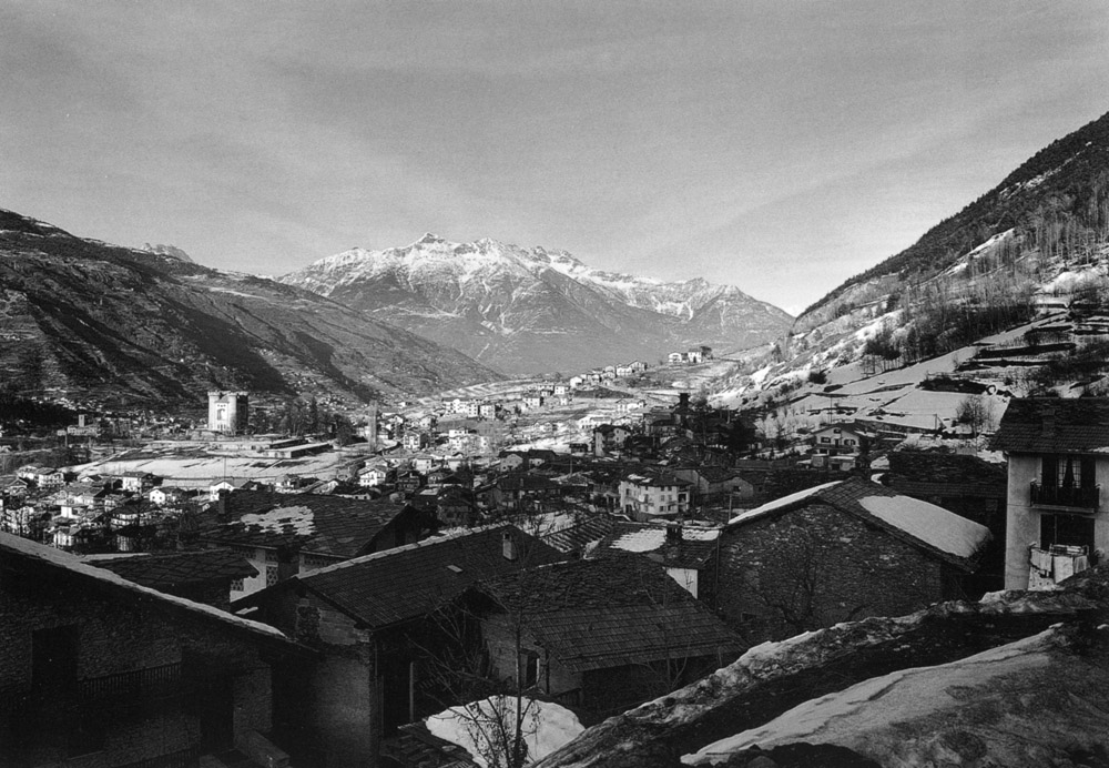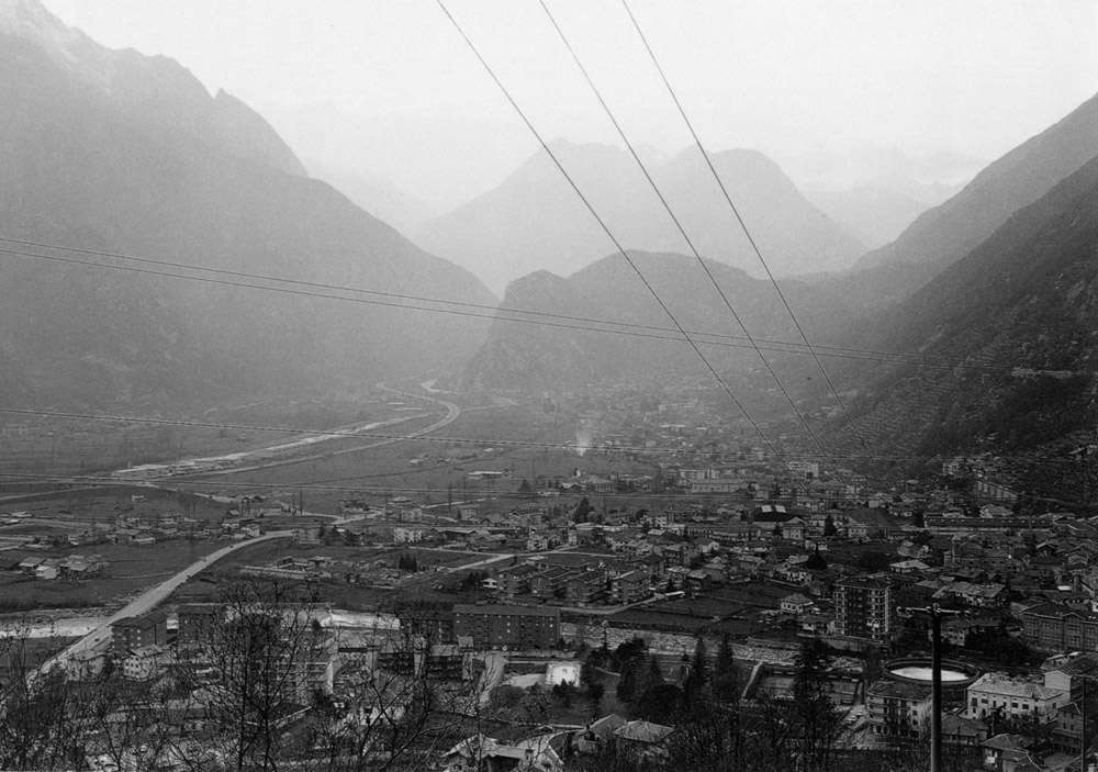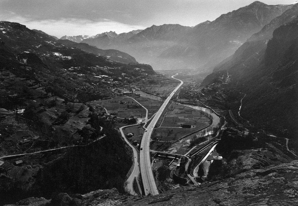 Già l’entrata in Valle è una dichiarazione: s’annuncia con un muraglione di cemento sulla sinistra, una roccia che anticipa le prima balze dei monti e, dritto davanti, prima della grande curva dell’autostrada, la lontananza di stabilimenti industriali con la loro torre d’acqua. Un’immagine che anticipa quella lettura multipla che ritroviamo in molte immagini di Basilico, e che è sintetizzata magistralmente nelle vedute d’infilata dall’alto verso Pont-Saint-Martin: dove la congerie dei segnali è magicamente ordinata in un coro polifonico di rara potenza ed espressività.