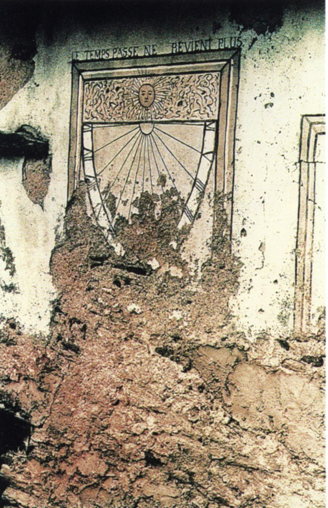 L’apparente aridità e frammentarietà dei segni che lo sguardo della fotografa riesce a selezionare e la più diretta testimonianza di un approccio esclusivamente espressivo, da cui esula ogni intenzione descrittiva. La stessa insistenza graficheggiante, qualche intervento di manipolazione alla cappellina sospesa tra le nuvole, una certa concettualizzazione dell’immagine testimoniano che Giuliana Traverso si muove secondo una sensibilità prettamente artistica, alla scoperta dei segni in cui pare condensarsi la storia dell’uomo. E l’iscrizione sulla sua meridiana -Le temps passe ne revient plus- mi pare, assai più che una felice occorrenza occasionate, una perfetta sintesi di questo appassionato e insieme malinconico percorso, che interpreta molto bene lo spirito delle “neiges dantan”.