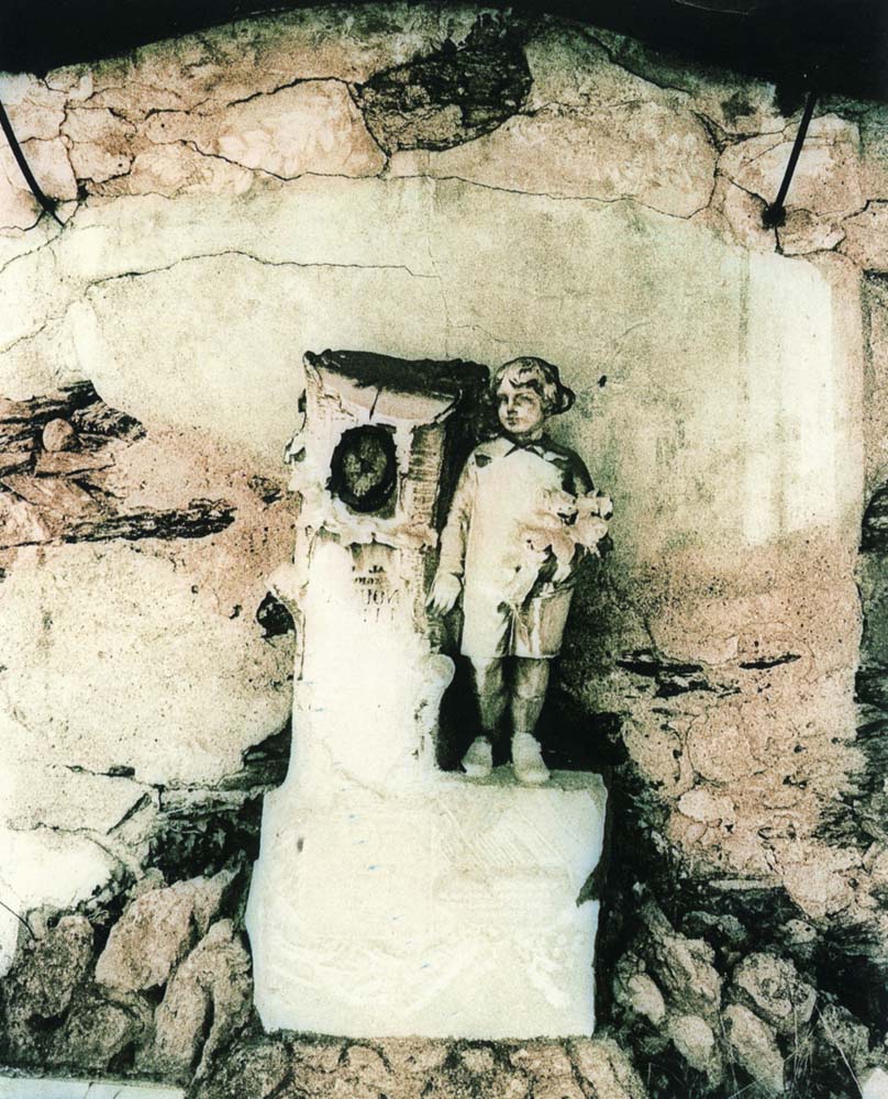 Minimalista ed anticonformista, come quasi sempre, nella scelta dei soggetti (che credo pochissimi reputerebbero degni di attenzione) Giuliana Traverso ci propone muri screpolati, una cappellina con qualche ciuffo di fiori rinsecchiti, una piccola statua cimiteriale, graffiti popolari, muovendosi soprattutto sul filo del tempo e del suo lavorio di sedimentazione, fisica e psicologica.