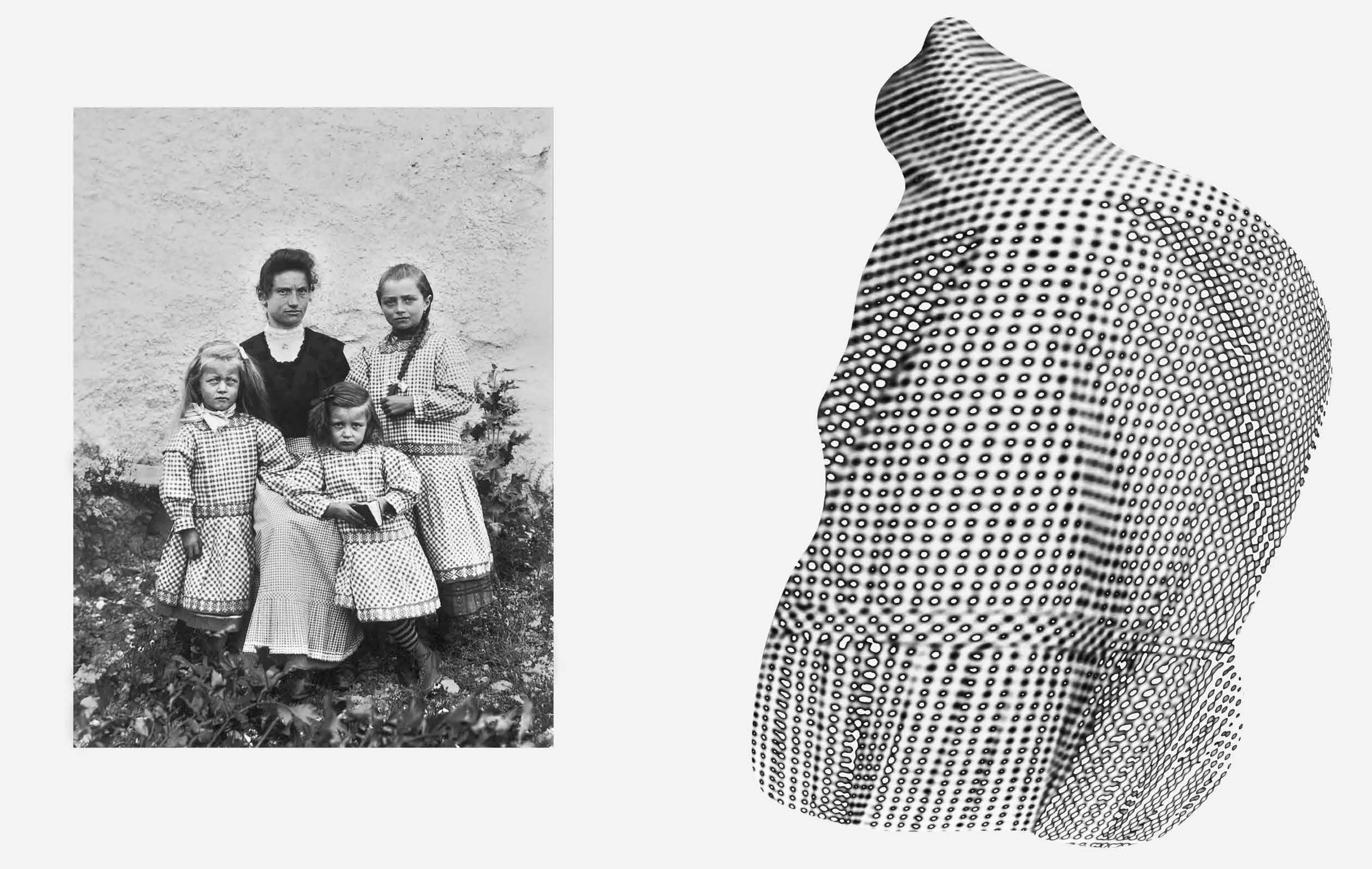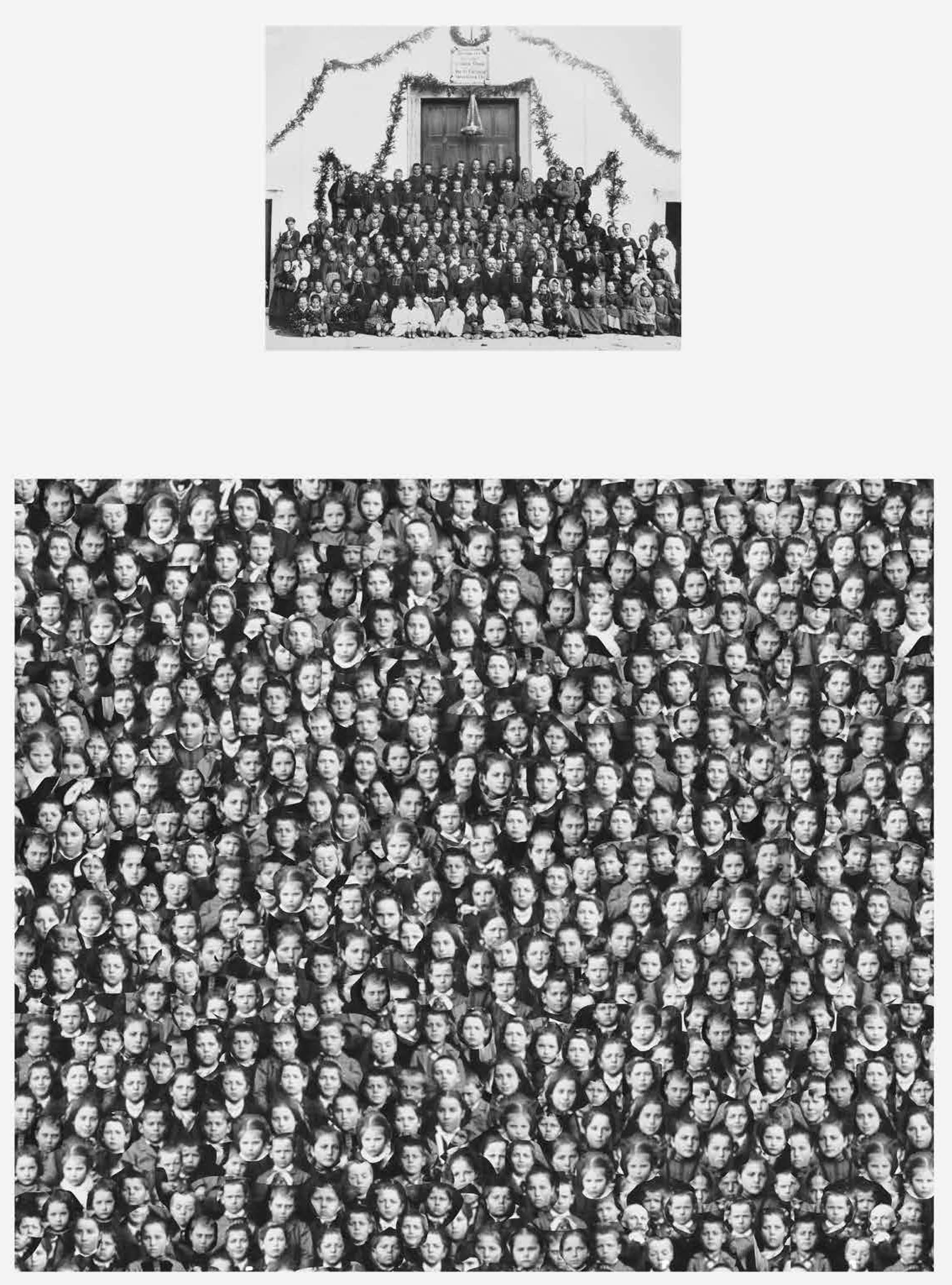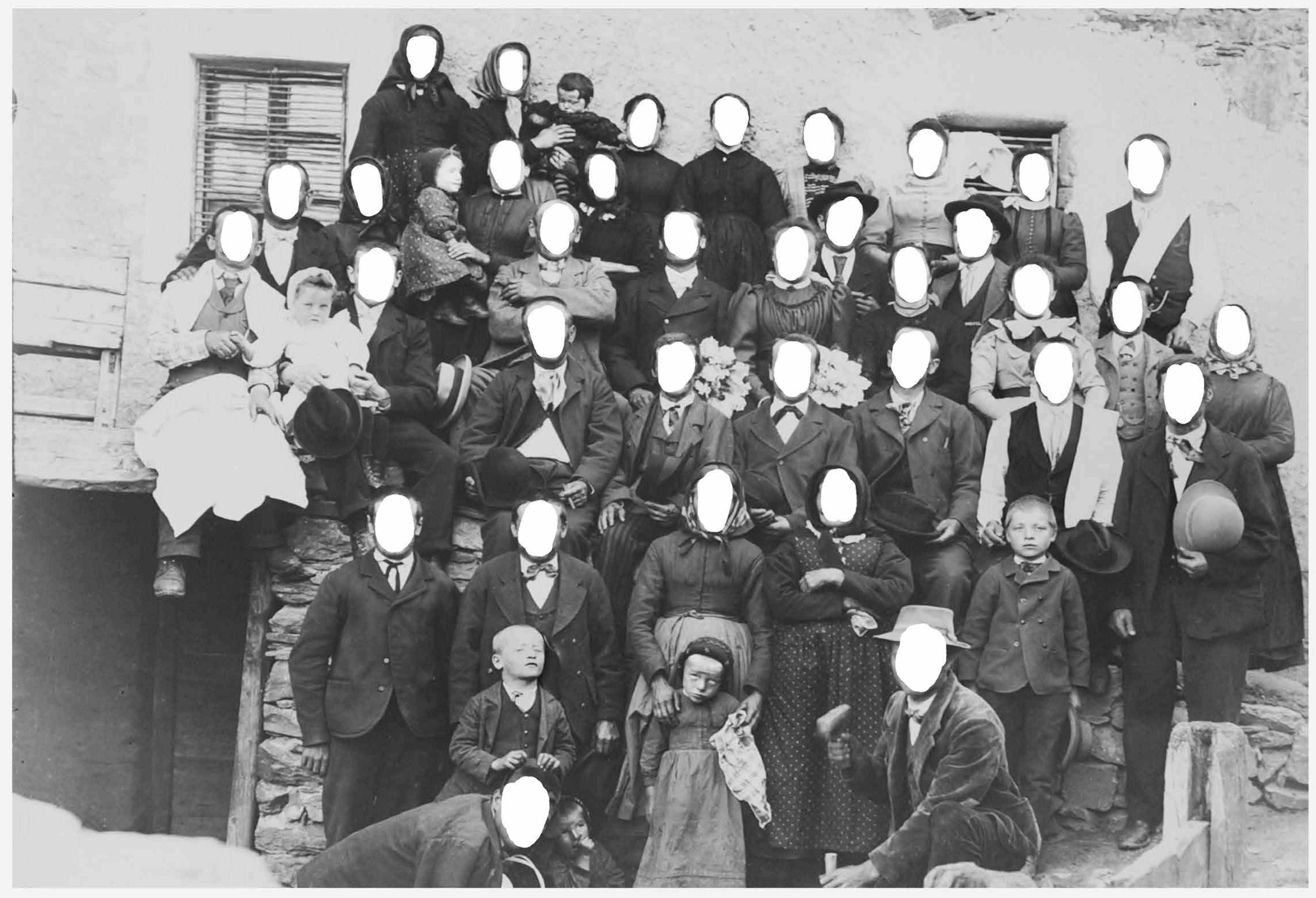 È il materiale fotografico risalente tra la fine ‘800 e l’inizio ‘900 realizzato da Don Emile Bionaz. Ritratti di paesani, gruppi di villani, insiemi di persone a cui Cresci sottrae volti impedendoci di individuarne la sembianza ma permettendoci così di valutare e soffermarci su ben altro di quell’immagine… ruba i tessuti di vesti povere per comporre grafiche che visivamente rimandano a intenzioni visive distinte… copia e incolla fisionomie per un grande e quasi infinito puzzle che, ripetendo se stesso, propone considerazioni sulla circolare ripetitività dello spazio geografico umano… ruba strumenti di lavoro o gesta agricole per comporre insiemi che determinano attenzioni su ciò che non è evidente nella fotografia originale, ma attenzione: Cresci fa questa operazione non per evidenziare banalmente delle forme ma bensì per proporre riflessioni sull’anteriore a noi, su ciò che nell’originale ci appare come un quotidiano non nostro, troppo distante da noi… ecco, tutto questo Cresci ce lo restituisce come il nostro passato prossimo (o grammaticalmente anche chiamato: il perfetto composto).